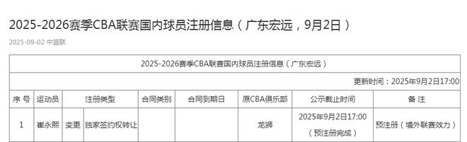 除此之外,按照CBA联盟规定,崔永熙返回CBA联赛后已经年满22岁,他需要与新东家重新签署B类合同,双方已在昨天(9月16日)完成签约。目前崔永熙的具体签约细节尚未公布,具体年限需要等待进一步的消息,而广东男篮此前已经为崔永熙完成预注册。