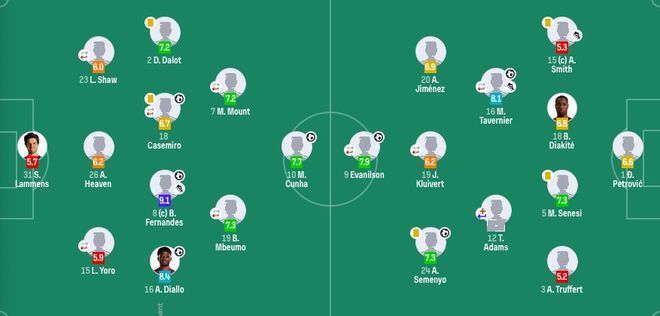 曼联首发:31-拉门斯、2-达洛特、15-约罗(69'6-利桑德罗-马丁内斯)、26-海文、23-卢克-肖(93'13-多古)、18-卡塞米罗(61'37-梅努)、8-B费、7-芒特(69'30-谢什科)、16-阿马德-迪亚洛、10-库尼亚、19-姆伯莫(93'11-齐尔克泽)